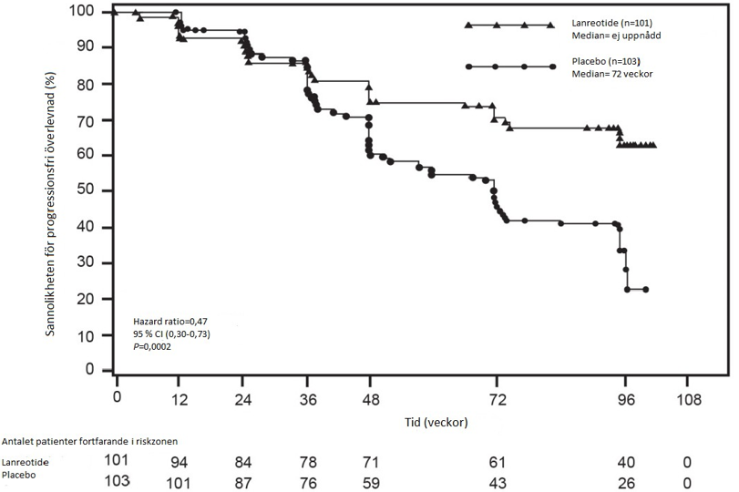 Patienterna randomiserades i förhållandet 1:1 för att antingen få Lanreotid120 mg var 28:e dag (n=101) eller placebo (n=103). Randomiseringen stratifierades för tidigare behandling vid studiens start och om patienten progredierat eller ej vid baslinjen mätt med RECIST 1.0 (Response Evaluation Criteria in Solid Tumors) under en 3–6 månaders screening fas.