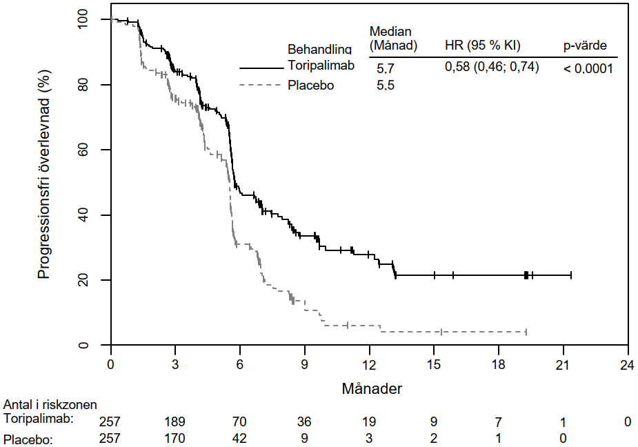 Behandling med toripalimab eller placebo fortsatte till sjukdomsprogression enligt kriterier för utvärdering av respons i solida tumörer (RECIST) v1.1 (med det undantag som anges nedan), oacceptabel toxicitet eller i högst 2 år. Administrering av toripalimab tilläts efter radiografisk progression om patienten hade nytta av behandlingen enligt prövarens bedömning. Tumörbedömningar gjordes var 6:e vecka under de första 12 månaderna och därefter var 9:e vecka. Det huvudsakliga effektmåttet var progressionsfri överlevnad (PFS) bedömd av den blindade oberoende granskningskommittén (BIRC) enligt RECIST v1.1.