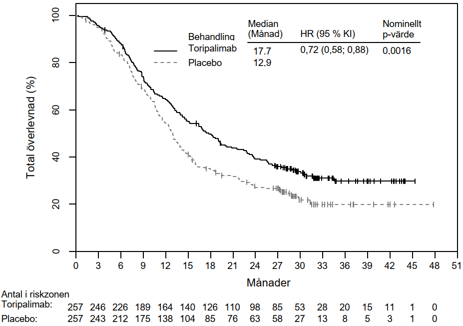 Studien visade statistiskt signifikanta förbättringar av BIRC-bedömd PFS och OS för patienter som randomiserats till toripalimab i kombination med cisplatin/gemcitabin jämfört med cisplatin och gemcitabin med placebo.