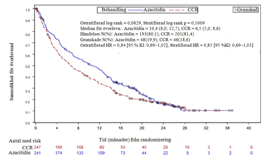 Vid ITT-analysen av 488 patienter (241 azacitidin och 247 CCR) associerades azacitidinbehandlingen med en medianöverlevnad på 10,4 månader mot 6,5 månader för patienter som fick CCR-behandling, en skillnad på 3,8 månader, med ett stratifierat log-rank p-värde på 0,1009 (tvåsidigt). Riskkvoten för behandlingseffekten var 0,85 (95% KI = 0,69; 1,03). De ettåriga överlevnadsfrekvenserna var 46,5% för patienter som fick azacitidin mot 34,3% för patienter som fick CCR.