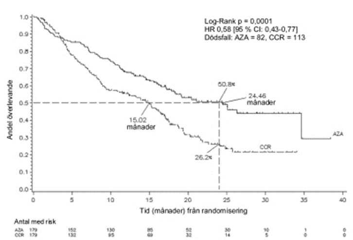 Överlevnadsnyttan med azacitidin var konsekvent oavsett vilken CCR (enbart BSC, lågdos-cytarabin plus BSC eller induktionskemoterapi av standardtyp plus BSC) som användes i kontrollarmen.