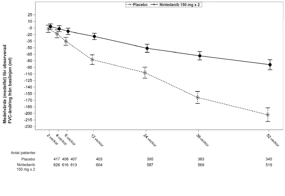 * Efter 24 veckors behandling fick alla patienter nintedanib i den öppna delen av studien.