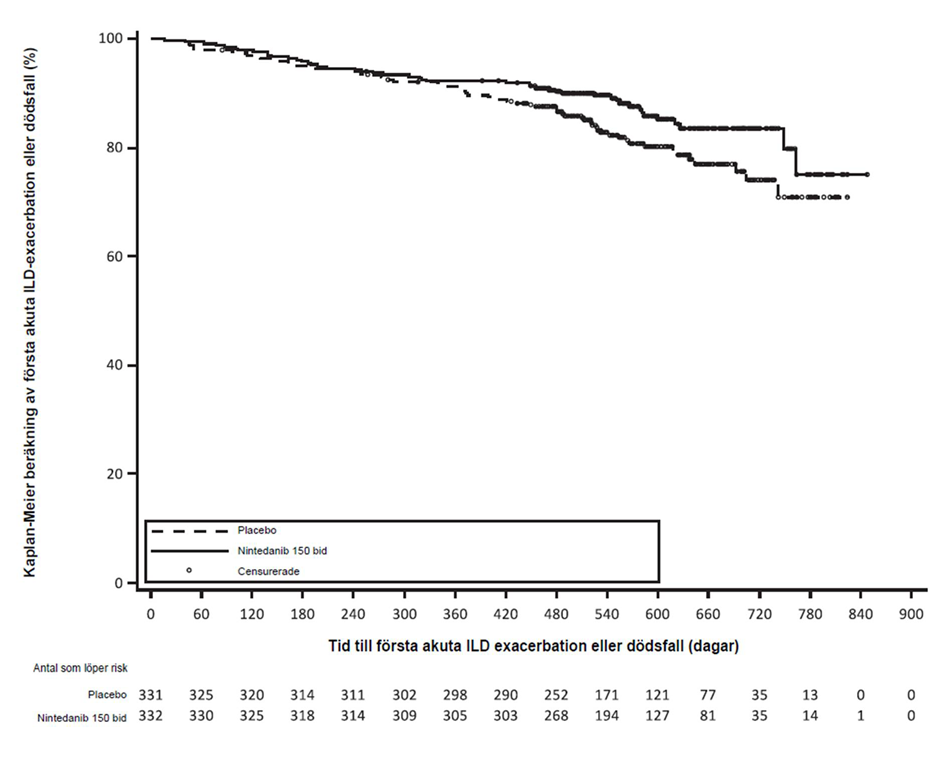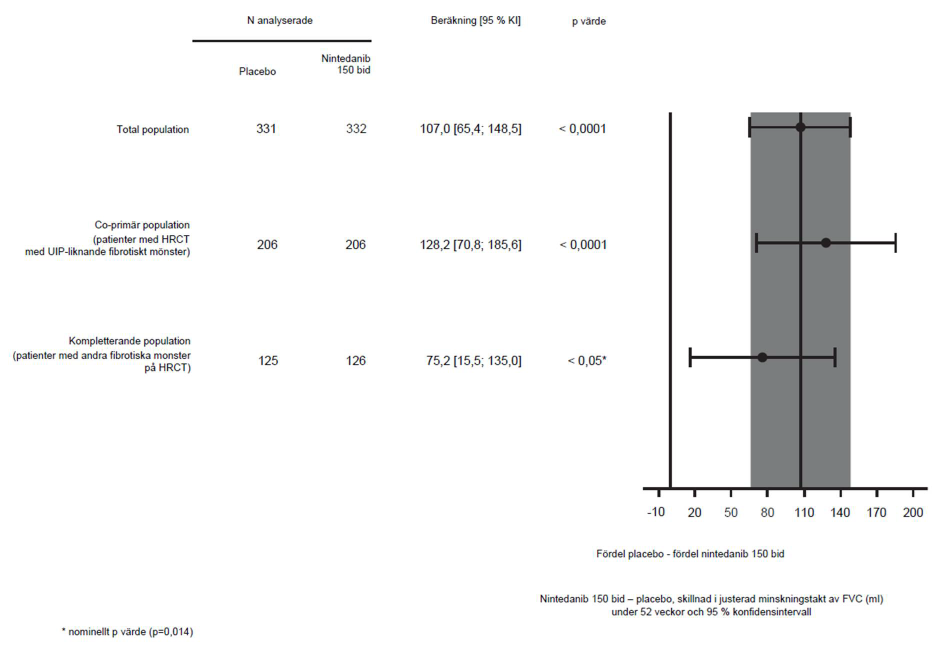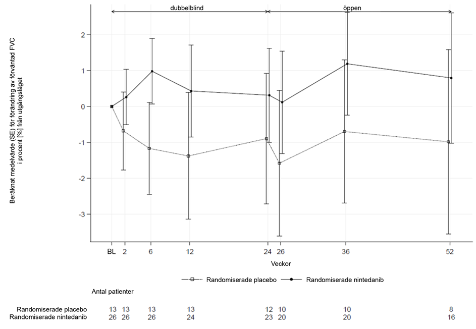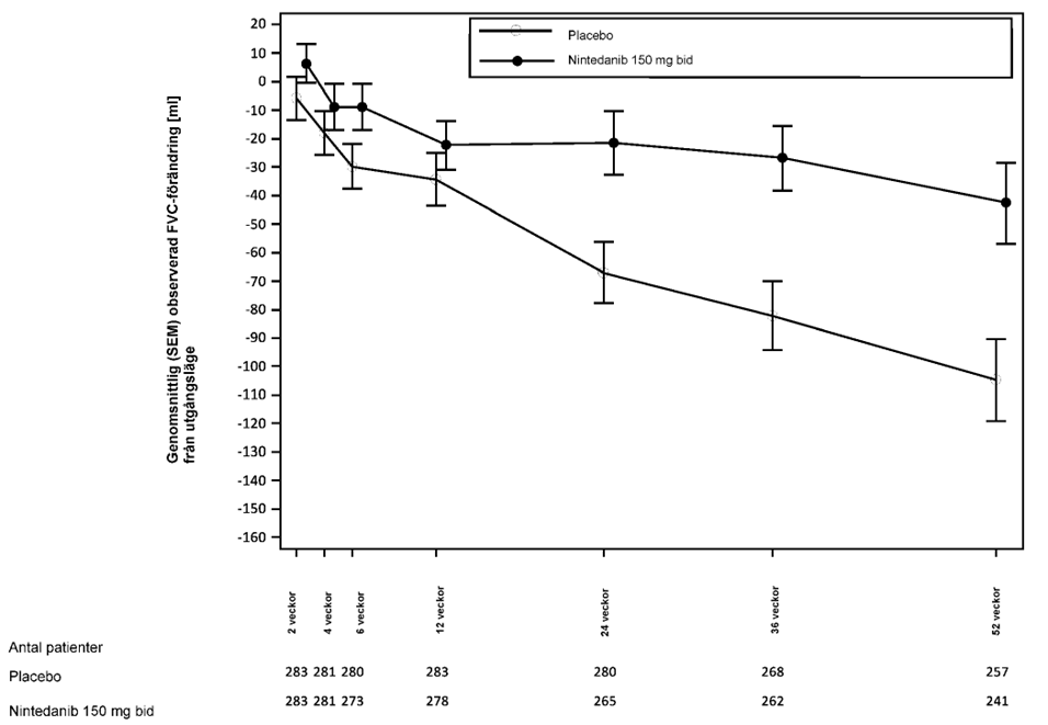 * Efter 24 veckors behandling fick alla patienter nintedanib i den öppna delen av studien.