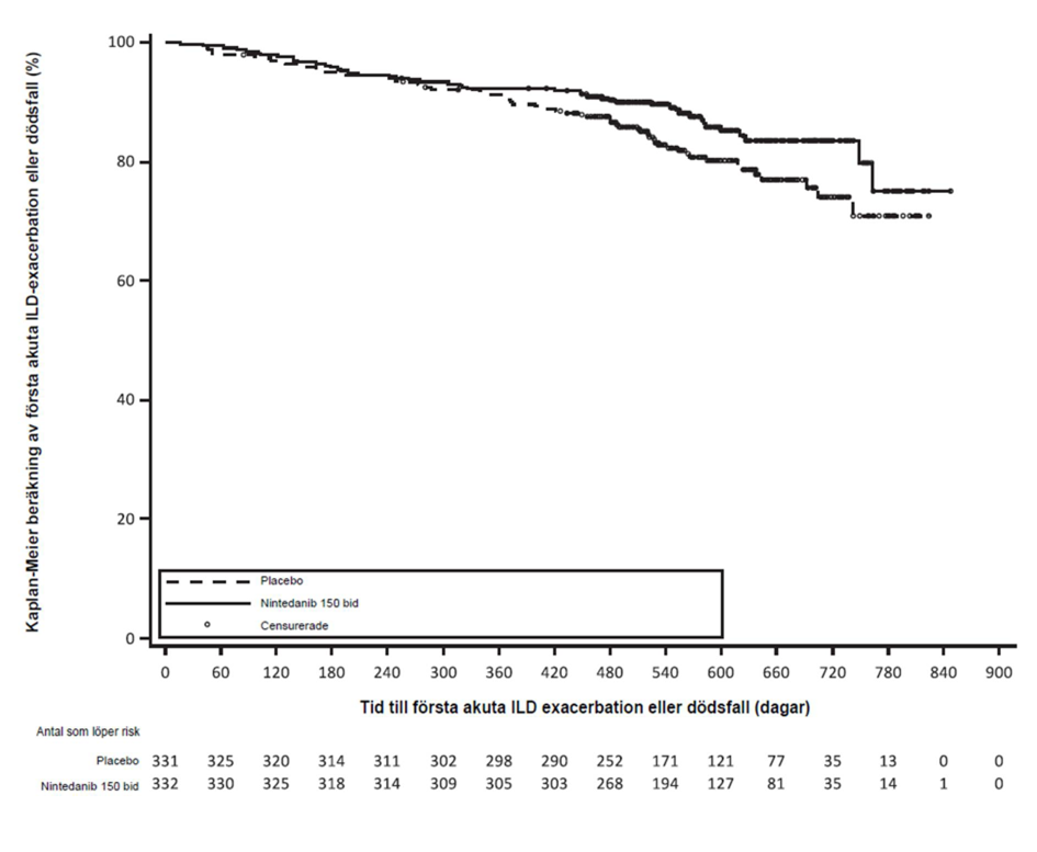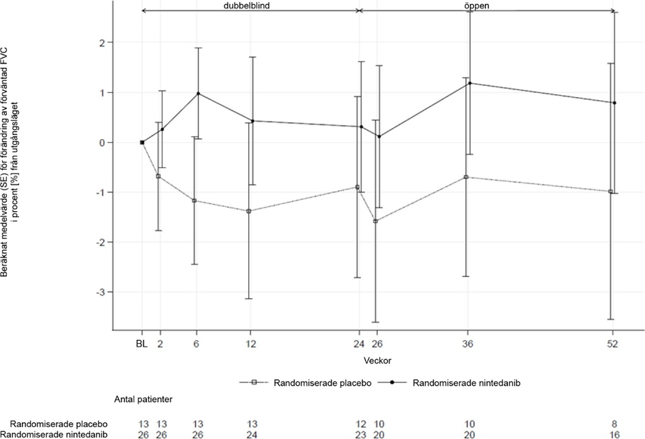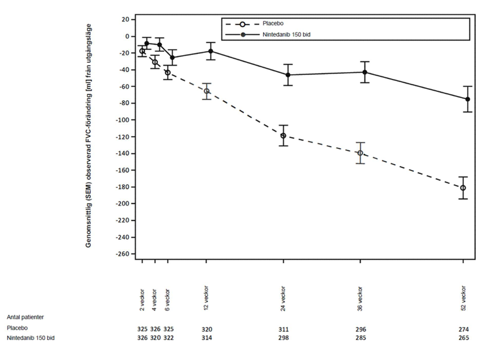 * Efter 24 veckors behandling fick alla patienter nintedanib i den öppna delen av studien.