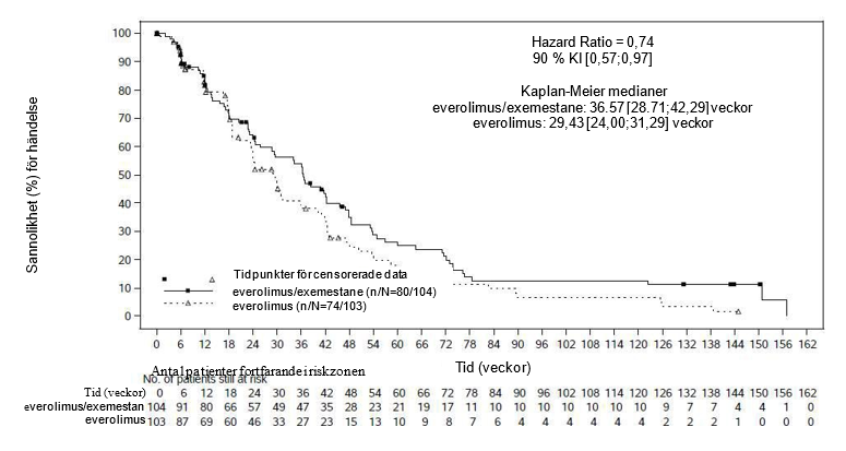 Resultatet för den slutliga PFS-analysen med 154 händelser baserat på lokal bedömning visade en beräknad HR på 0,74 (90 % KI: 0,57; 0,97) till fördel för gruppen som fick everolimus plus exemestan jämfört med everolimus. I median var PFS 8,4 månader (90 % KI: 6,6; 9,7) respektive 6,8 månader (90 % KI: 5,5; 7,2).