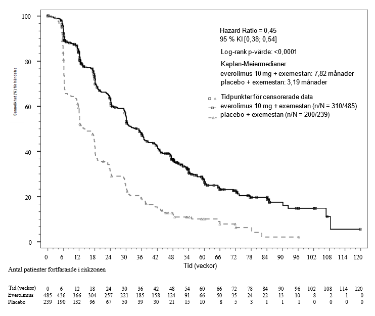 Totalt randomiserades 724 patienter 2:1 till antingen kombinationen everolimus (10 mg dagligen) plus exemestan (25 mg dagligen) (n=485) eller till placebo plus exemestan (25 mg dagligen) (n=239). Vid tidpunkten för analys av total överlevnad (OS) var behandlingstiden med everolimus i median 24 veckor (1,0-199,1 veckor). För patienterna som fick everolimus plus exemestan var behandlingstiden längre, i median 29,5 veckor (1,0-199,1), jämfört med 14,1 veckor (1,0-156,0 veckor) för placebo plus exemestan-gruppen.
