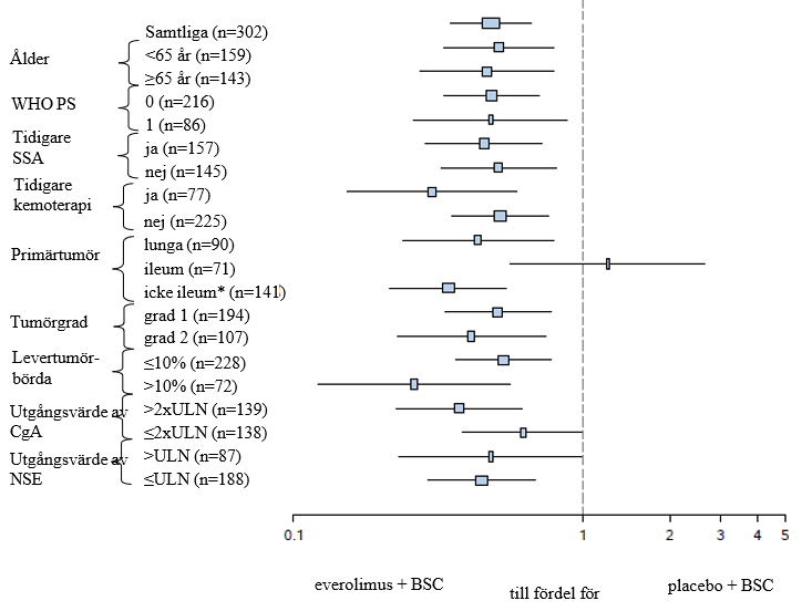 I understödjande analyser observerades en positiv behandlingseffekt i alla subgrupper med undantag för subgruppen som hade primärtumör med ursprung i ileum (ileum: HR=1,22 [95 % KI: 0,56-2,65], icke ileum: HR=0,34 [95 % KI: 0,22-0,54], lunga: HR=0,43 [95 % KI: 0,24-0,79]) (se figur 5).