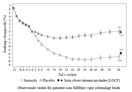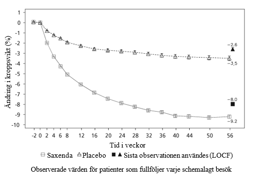 Komplett analysset. Baseline-värden är medelvärden, ändringar från baseline vid vecka 56 är beräknade medelvärden (minsta kvadratmetoden) och behandlingskontraster vid vecka 56 är beräknade behandlingsskillnader. Beräknade oddskvoter visas för andelen patienter som förlorat ≥ 5/> 10% kroppsvikt. För saknade värden efter baseline användes principen ”last observation carried forward” (LOCF), dvs. det sista uppmätta värdet användes som slutvärde. ** p < 0,0001. CI=konfidensintervall. SD=standardavvikelse.