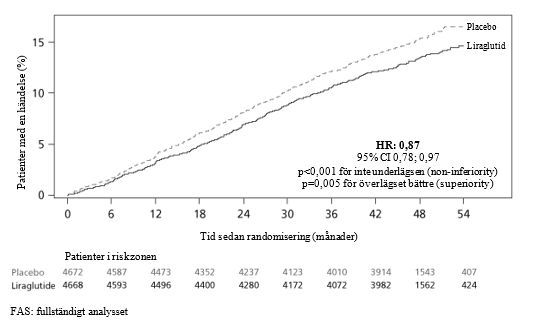 Exponeringstid var mellan 3,5 och 5 år. Genomsnittsåldern var 64 år och genomsnittligt BMI var 32,5 kg/m². Baseline HbA1c var 8,7 i genomsnitt och hade efter 3 år förbättrats med 1,2% DCCT standard hos patienter som tilldelats liraglutid och med 0,8% DCCT standard hos patienter som tilldelats placebo. Primärt utfallsmått var tid från randomisering till första större negativa kardiovaskulära händelse (Major Adverse Cardiovascular Events, MACE): kardiovaskulär död, icke-fatal hjärtinfarkt eller icke-fatal stroke.