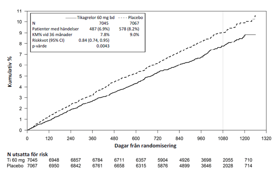RRR för det sammansatta effektmåttet från 1 till 360 dagar (17 % RRR) och från 361 dagar och därefter (16 % RRR) var likartad. Det finns begränsat med data kring effekt och säkerhet för tikagrelor bortom 3 års förlängd behandling.