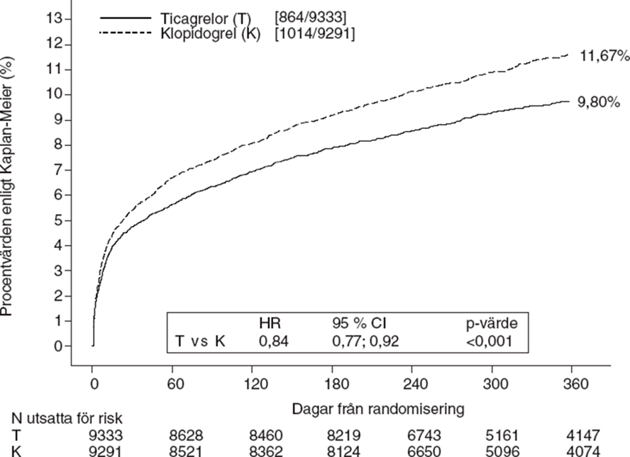 Ett kombinerat sammansatt effektmått för effekt och säkerhet (kardiovaskulär död, hjärtinfarkt, stroke eller PLATO-definierad ”totalt större” blödning) tyder på att effektvinsten för tikagrelor jämfört med klopidogrel inte uppvägs av större blödningshändelser (ARR 1,4 %, RRR 8 %, HR 0,92; p=0,0257) under 12 månader efter akut koronart syndrom.