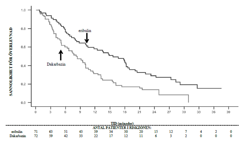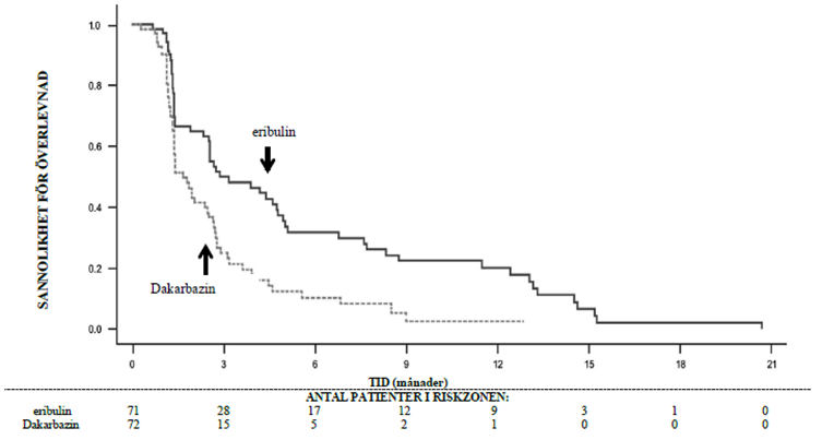 I studie 309 sågs en statistiskt signifikant förbättring av total överlevnad (OS) hos patienter som randomiserats till eribulinarmen jämfört med kontrollarmen. Detta översattes till en förbättring på 2 månader av median-OS (13,5 månader för eribulinbehandlade patienter mot 11,5 månader för dakarbazinbehandlade patienter). Det fanns ingen signifikant skillnad i progressionsfri överlevnad eller total svarsfrekvens mellan behandlingsarmarna i den totala populationen.