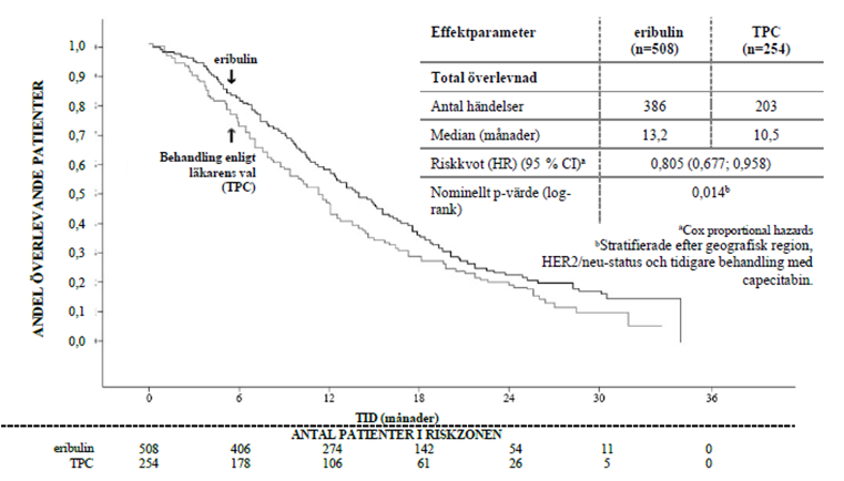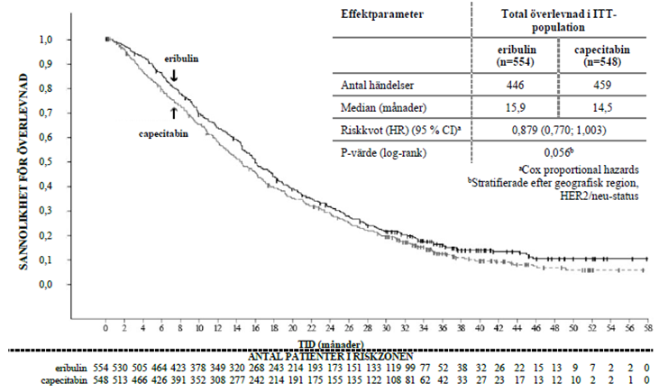 Den positiva effekten på total överlevnad sågs både i capecitabinnaiva patientgrupper och i patientgrupper som tidigare behandlats med capecitabin. Den uppdaterade analysen av total överlevnad visade en överlevnadsfördel för eribulingruppen jämfört med TPC-gruppen både hos patienter som tidigare behandlats med capecitabin, med en riskkvot på 0,787 (95 % CI: 0,645; 0,961), och för de capecitabinnaiva patienterna med en motsvarande riskkvot på 0,865 (95 % CI: 0,606; 1,233).