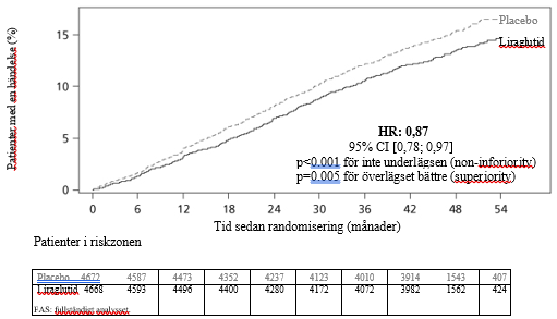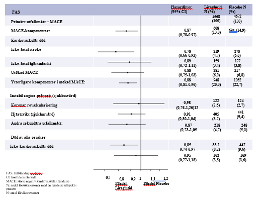 Primärt utfallsmått var tid från randomisering till första större negativa kardiovaskulära händelse (Major Adverse Cardiovascular Events, MACE): kardiovaskulär död, icke-fatal hjärtinfarkt, eller icke-fatal stroke. Liraglutid var överlägset bättre på att förebygga MACE jämfört med placebo (bild 1). Beräknad hazardkvot var genomgående under 1 för alla 3 MACE-komponenter.