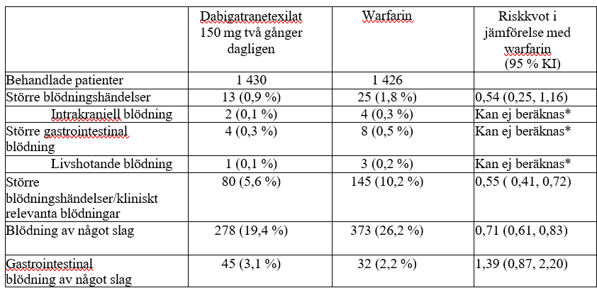 Blödningar som bedöms vara större blödning rapporterades hos 4 patienter (2,3 %) i dabigatranetexilatgruppen och hos 2 patienter (2,2 %) i SOC-gruppen. Det fanns ingen statistiskt signifikant skillnad i tiden till första större blödningshändelse. Trettioåtta patienter (21,6 %) i dabigatranetexilatarmen och 22 patienter (24,4 %) i SOC-armen hade någon händelse som bedömdes som blödning, varav de flesta kategoriserades som mindre. Det kombinerade effektmåttet blödningshändelse som bedöms vara större blödning eller kliniskt relevant, icke-större blödning (under behandling) rapporterades hos 6 (3,4 %) patienter i dabigatranetexilatgruppen och hos