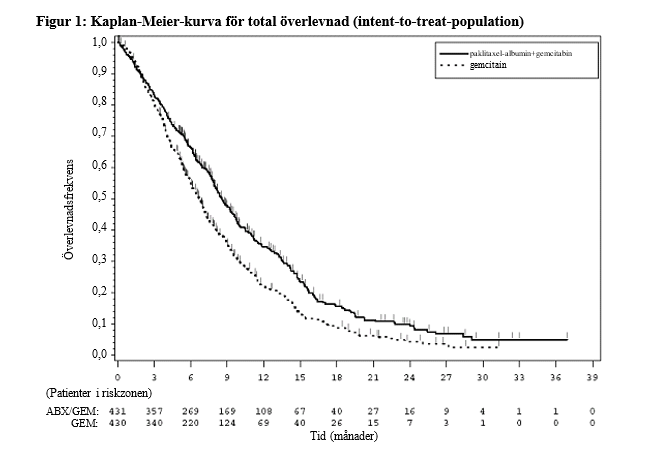 Det sågs en statistiskt signifikant förbättring av total överlevnad för patienter som behandlades med nanopartiklar av humant albuminserum-paklitaxel/gemcitabin jämfört med enbart gemcitabin, med en ökning på 1,8 månader av total medianöverlevnad, 28 % total minskning av risk för dödsfall, 59 % förbättring av frekvenserna för 1-årsöverlevnad och 125 % förbättring av frekvenserna för 2-årsöverlevnad.