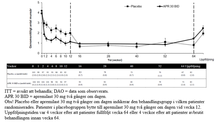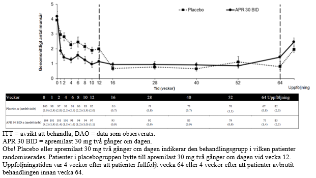 Av de 104 patienter som ursprungligen randomiserades till apremilast 30 mg två gånger om dagen, fortsatte 75 patienter (ungefär 72 %) att genomgå denna behandling vid vecka 64. En signifikant minskning av det genomsnittliga antalet munsår och smärtan på grund av munsår observerades i behandlingsgruppen som tog apremilast 30 mg två gånger om dagen jämfört med placebogruppen vid varje besök, så tidigt som vecka 1, till och med vecka 12 för antal munsår (p≤ 0,0015) och för smärta på grund av munsår (p≤ 0,0035). Bland patienter som behandlades kontinuerligt med apremilast och var kvar i studien, observerades förbättringar av munsår och minskad smärta på grund av munsår till och med vecka 64 (figur 3 och 4).