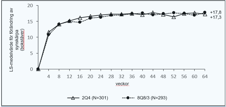 Inga kliniskt betydande skillnader sågs mellan 8Q8/3‑ och 2Q4‑grupperna i förändringar i totalpoäng enligt NEI VFQ‑25 vecka 36 och vecka 64 från studiestart.