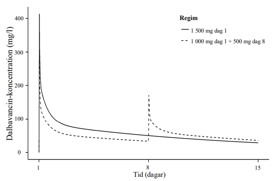 Plasmakoncentration av dalbavancin över tid efter behandling med två doser respektive behandling med en dos visas i figur 1.
