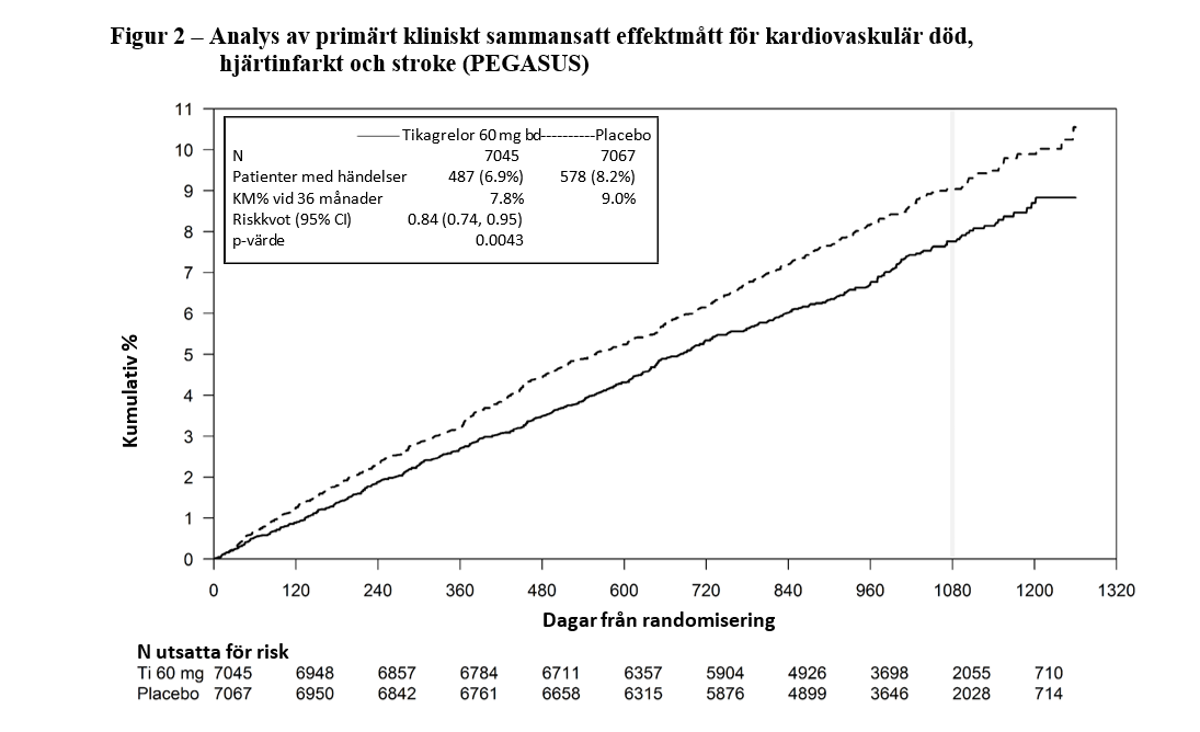 I relation till enbart ASA, reducerade tikagrelor 60 mg två gånger dagligen signifikant det primära sammansatta effektmåttet för kardiovaskulär död, hjärtinfarkt och stroke. Var och en av komponenterna bidrog till reduktionen av det primära sammansatta effektmåttet (kardiovaskulär 17 % RRR, hjärtinfarkt 16 % RRR och stroke 25 % RRR).