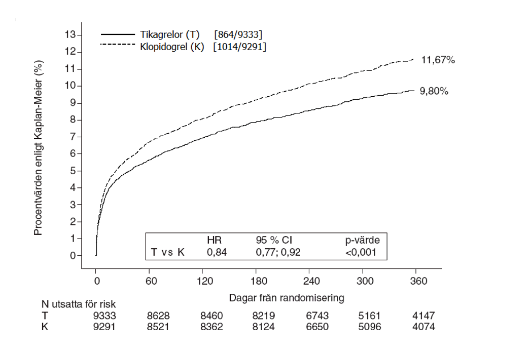 Resultatet visade sig tidigt (absolut riskreduktion [ARR] 0,6 % och relativ riskreduktion [RRR] 12 % efter 30 dagar), med en konstant behandlingseffekt under hela tolvmånadersperioden som gav en ARR på 1,9 % per år med en RRR på 16 %. Detta tyder på att det är lämpligt att behandla patienterna med tikagrelor 90 mg två gånger dagligen i 12 månader (se avsnitt Dosering). Behandling av 54 patienter med akut kranskärlssjukdom med tikagrelor i stället för klopidogrel förhindrar 1 aterotrombotisk händelse; behandling av 91 förhindrar 1 kardiovaskulär död (se figur 1 och tabell 4).