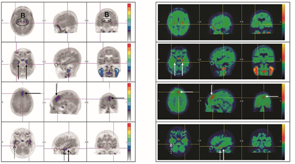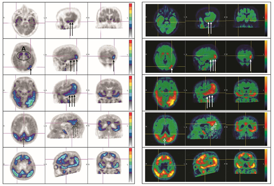 Rad 4: Patient med små, isolerade foci med icke-sammanhängande och varierande upptag i PLT (heldragna pilar); ökad aktivitet i ALT (streckade pilar). Detta mönster kan också ses i occipital- eller parietalområdet.