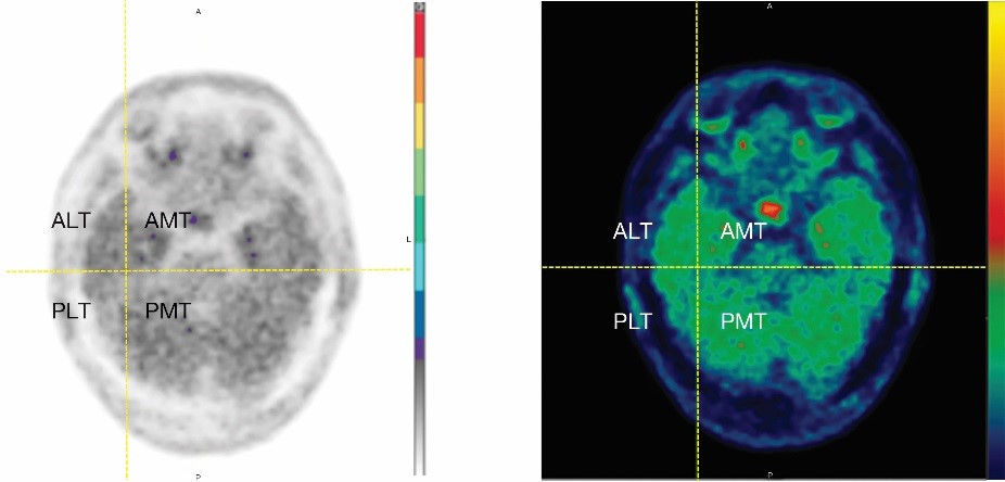 För att utvärdera temporalloberna delas dessa in i fyra kvadranter genom att det horisontella hårkorset placeras omedelbart posteriort om hjärnstamskärnan och sedan skrollas nedåt så att det vertikala hårkorset placeras genom den bredaste delen av temporalpolen, varvid kvadranterna anterior lateral temporal (ALT), anterior mesial temporal (AMT), posterior lateral temporal (PLT) och posterior mesial temporal (PMT) erhålles. Se figur 2 för ett exempel (den vänstra och högra bilden visar samma skanning i två olika färgskalor).