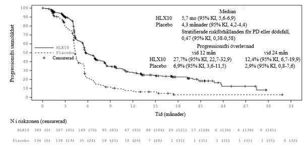 Uppdaterad analys efter avblindning med längre uppföljningsvaraktighet (median: 19,7 månader) genomfördes innan slutdatumet den 13 juni 2022 då 100% av fördefinierade OS-händelser observerades (definierade cirka 342, faktiska 363 OS-händelser). Median OS var 15,8 månader i serplulimabgruppen och 11,1 månader i placebogruppen. Den stratifierade HR (95% KI) var 0,62 (0,50, 0,76). Medianvärdet för PFS genom IRRC-bedömning per RECIST 1,1 var 5,7 månader respektive 4,3 månader med en stratifierad HR (95% KI) på 0,47 (0,38, 0,58). Effektresultaten av den slutliga analysen överensstämde med den primära analysen. Kaplan‑Meierkurvor för OS och PFS för slutlig analys presenteras i figurerna 1 och 2.