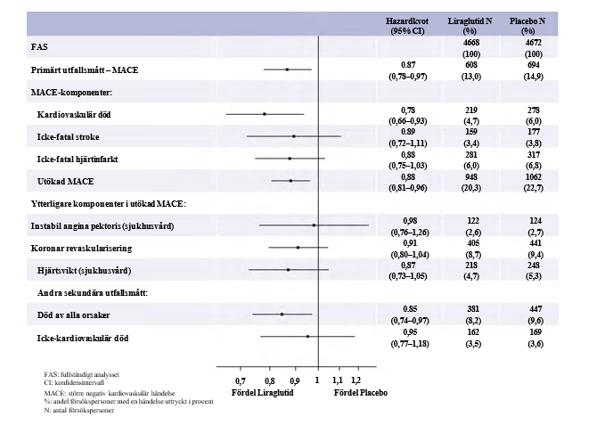 Primärt utfallsmått var tid från randomisering till första större negativa kardiovaskulära händelse (Major Adverse Cardiovascular Events, MACE): kardiovaskulär död, icke‑fatal hjärtinfarkt, eller icke‑fatal stroke. Liraglutid var överlägset bättre på att förebygga MACE jämfört med placebo (bild 1). Beräknad hazardkvot var genomgående under 1 för alla 3 MACE‑komponenter.