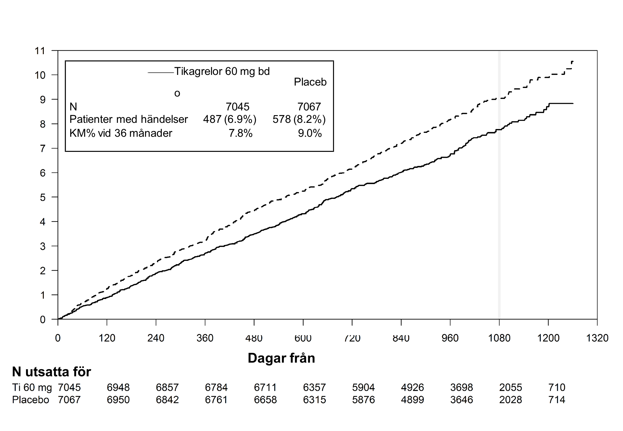 I relation till enbart ASA, reducerade tikagrelor 60 mg två gånger dagligen signifikant det primära sammansatta effektmåttet för kardiovaskulär död, hjärtinfarkt och stroke. Var och en av komponenterna bidrog till reduktionen av det primära sammansatta effektmåttet (kardiovaskulär död 17 % RRR, hjärtinfarkt16 % RRR och stroke 25 % RRR).