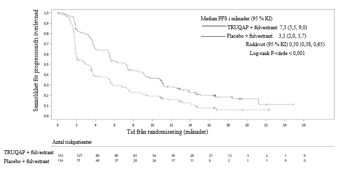 Vid brytpunkten den 15 augusti 2022 visade studien en statistiskt signifikant förbättring av PFS för patienter som fick TRUQAP plus fulvestrant jämfört med patienter som fick placebo plus fulvestrant, både i den totala populationen och i undergruppen med PIK3CA/AKT1/PTEN-förändringar (se tabell 9). En explorativ analys av PFS hos de 313 patienter (44 %) vars tumörer inte hade några PIK3CA/AKT1/PTEN-förändringar visade en riskkvot på 0,79 (95 % KI: 0,61, 1,02), vilket tyder på att skillnaden i den totala populationen främst tillskrevs effekten i populationen av patienter vars tumörer har PIK3CA/AKT1/PTEN-förändring. PFS‑resultaten enligt prövarens bedömning stöddes av överensstämmande resultat från en blindad oberoende central granskning (Blinded Independent Central Review, BICR). Den prövarbedömda objektiva svarsfrekvensen (objective response rate, ORR) hos patienter som fick TRUQAP plus fulvestrant och placebo plus fulvestrant var 22,9 % respektive 12,2 % i den totala populationen och 28,8 % respektive 9,7 % i undergruppen med förändringar.