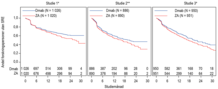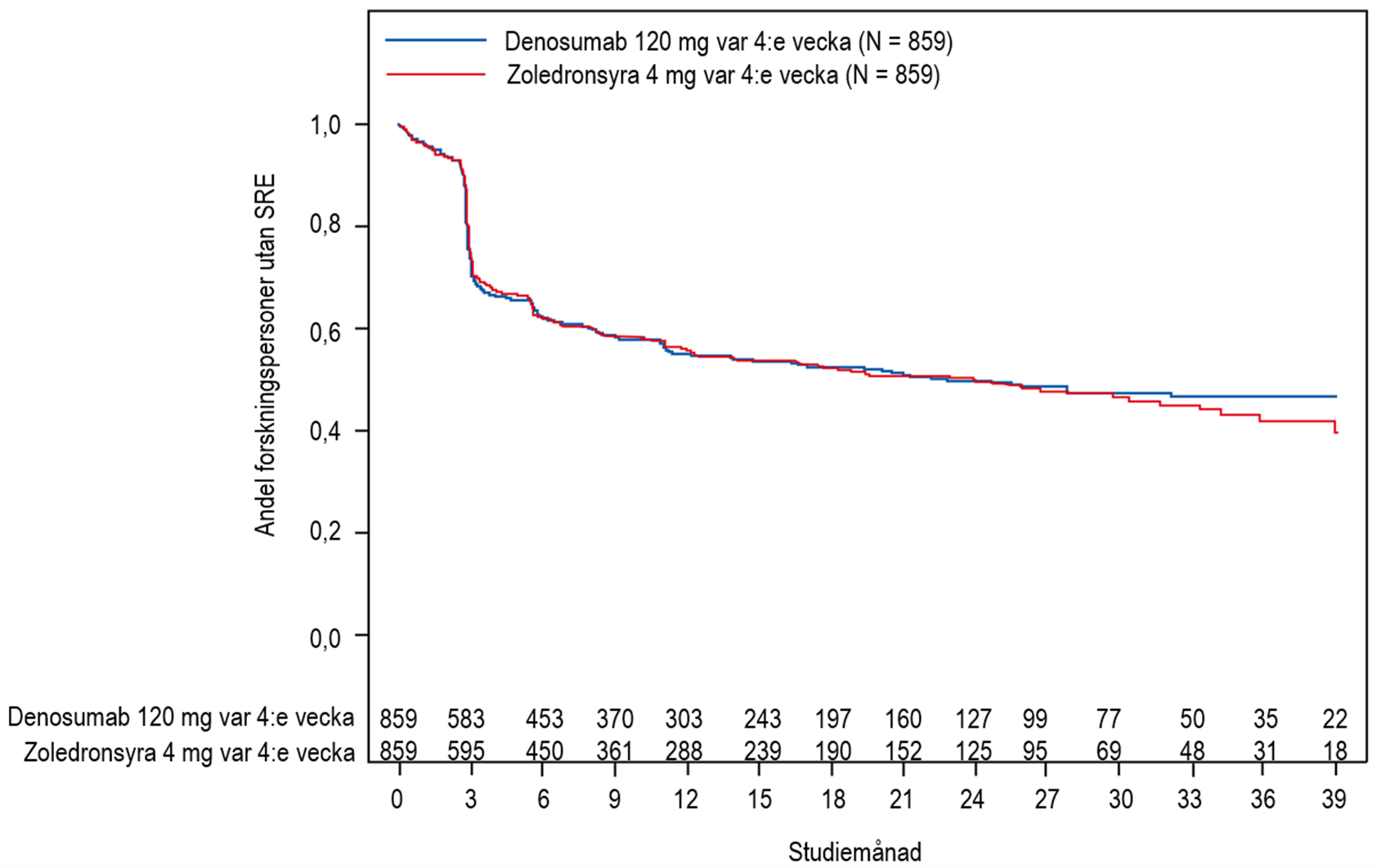 Effekt och säkerhet av 120 mg denosumab subkutant var 4:e vecka eller 4 mg zoledronsyra (dosjusterad vid nedsatt njurfunktion) i.v. (intravenöst) var 4:e vecka jämfördes i tre randomiserade, dubbelblindade, aktivt kontrollerade studier hos patienter med avancerad cancer med skelettmetastaser och som var behandlingsnaiva för intravenösa bisfosfonater: vuxna med bröstcancer (studie 1), andra solida tumörer eller multipelt myelom (studie 2) och kastratresistent prostatacancer (studie 3). I dessa kliniska studier med aktiv kontroll utvärderades säkerheten hos 5 931 patienter. Patienter med en anamnes av ONJ eller osteomyelit i käken, pågående tand‑ eller käkbesvär som krävde käkkirurgi, oläkta sår efter tand‑ eller käkkirurgi eller med ett inplanerat invasivt tandingrepp fick inte delta I dessa studier. De primära och sekundära effektmåtten utvärderade förekomst av en eller flera SRE. I studier där denosumab visade sig vara mer effektivt än zoledronsyra erbjöds patienterna deltagande i en på förhand specificerad fas med utökad behandling med denosumab på 2 år. En SRE definierades som något av följande: patologisk fraktur (kot‑ eller icke‑kotfraktur), strålbehandling av skelettet (inklusive användning av radioisotoper), skelettkirurgi eller ryggmärgskompression.