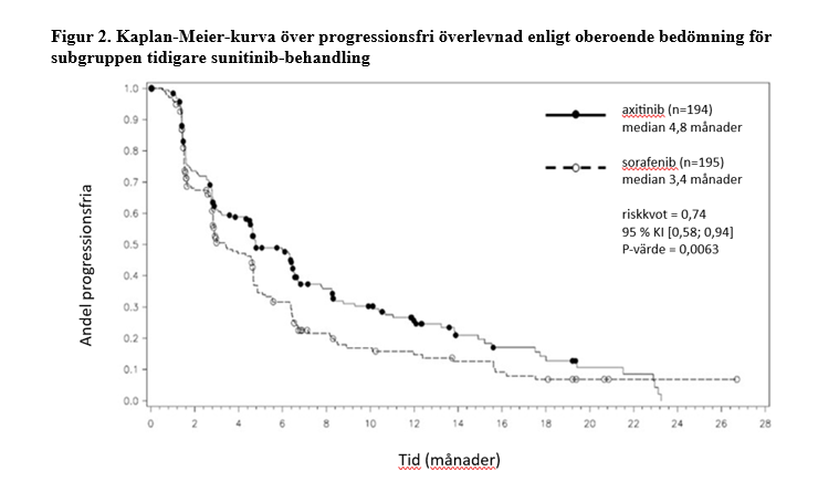 I den totala patientpopulationen och i de två huvudsubgrupperna (tidigare behandling med sunitinib respektive tidigare behandling med cytokin) förelåg en statistiskt signifikant fördel för axitinib framför sorafenib avseende det primära effektmåttet PFS (se tabell 2 och figur 1, 2 och 3). Effekten på median- PFS skilde sig åt i subgrupperna, indelade efter typ av tidigare behandling. Två av subgrupperna var för små för att ge tillförlitliga resultat (tidigare behandling med temsirolimus respektive tidigare behandling med bevacizumab). Man såg inga statistiskt signifikanta skillnader mellan grupperna avseende total överlevnad i totalpopulationen eller i subgrupperna, indelade efter tidigare behandling.