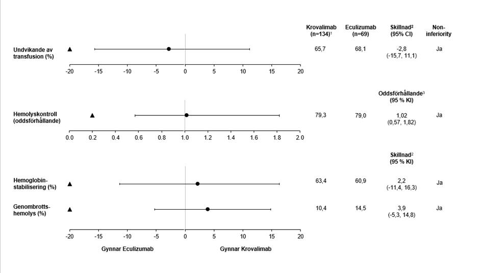 Demografi och karakteristika vid studiestarten för den randomiserade studiepopulationen var balanserade mellan behandlingsgrupperna. Medianvärdet för LDH vid studiestart var 1,01 × ULN (intervall: 0,6‑1,7) för krovalimab och 0,96 × ULN (intervall: 0,7–1,9) för ekulizumab. Andelen patienter med transfusioner i anamnesen under de 12 månaderna före screening, var 22,7 % i krovalimab-gruppen och 25 % i ekulizumab-gruppen, med ett medelvärde (SD) på 1,6 (3,7) och 2,3 (5,4) enheter transfunderat pRBC i krovalimab- respektive ekulizumab-gruppen. PNH-klonstorleken i median vid studiestart (intervallet) för totala erytrocyter, monocyter och granulocyter för krovalimabarmen vs. ekulizumabarmar är följande: 44,6 % (2,6 - 100) vs. 54,2 % (1,3 - 100), 88,6 % (13,8 - 100) vs. 96,4 % (7,6 – 99,9), respektive 88,1 % (5,2 - 100), vs. 95,7 % (7,9 – 99,9).