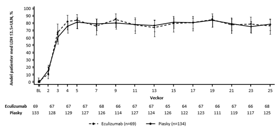 Supportiva data hos patienter med kliniskt stabilt byte till ekulizumab rapporterades från patienter i COMMODORE 1 (25 effektivitetsutvärderbara patienter) och COMMODORE 2 (29 effektivitetsutvärderbara patienter) som hade behandlats med ekulizumab i minst 24 veckor i den primära behandlingsperioden och hade LDH ≤ 1,5 × ULN vid byte till krovalimab vid studiestart.