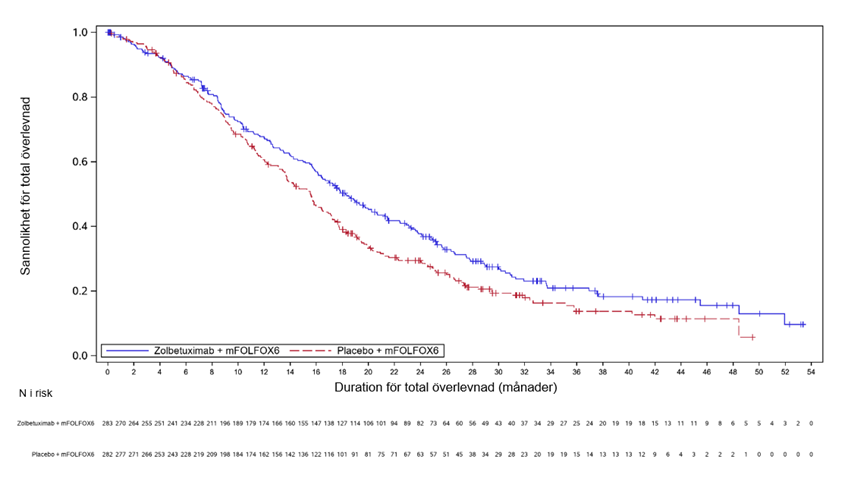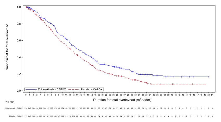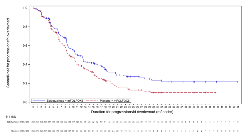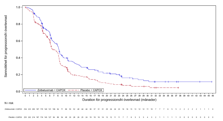 En kombinerad effektanalys för SPOTLIGHT och GLOW för slutgiltig OS och uppdaterad PFS resulterade i en median-PFS (enligt bedömning av IRC) på 9,2 månader (95 % KI: 8,4; 10,4) för zolbetuximab i kombination med mFOLFOX6/CAPOX jämfört med 8,2 månader (95 % KI: 7,6; 8,4) för placebo med mFOLFOX6/CAPOX [HR 0,712, 95 % KI: 0,610; 0,831] och en median-OS för zolbetuximab i kombination med mFOLFOX6/CAPOX på 16,4 månader (95 % KI: 15,0; 17,9) jämfört med 13,7 månader (95 % KI: 12,3; 15,3) för placebo med mFOLFOX6/CAPOX [HR 0,774, 95 % KI: 0,672; 0,892].