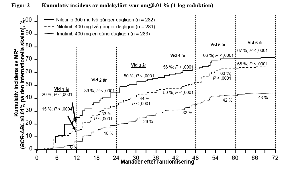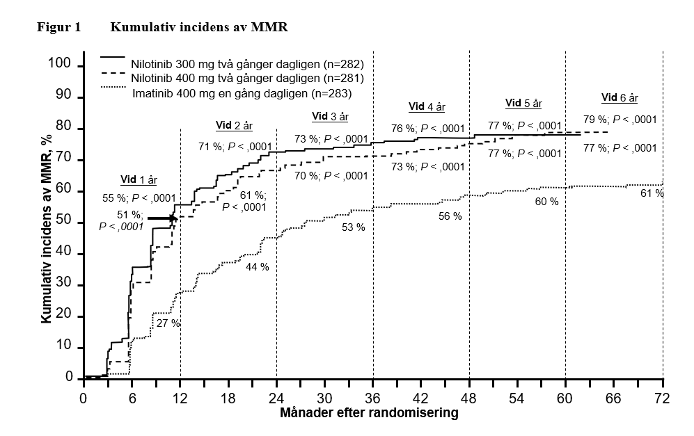 Patienter med bekräftad förlust av MR4 (MR4=BCR‑ABL/ABL ≤ 0,01 % IS) under den behandlingsfria perioden (förlust av MR4 konstaterad vid två på varandra följande mätningar med minst fyra veckor emellan) eller förlust av betydande molekylärt svar (MMR=BCR‑ABL/ABL ≤ 0,1 % IS) måste återuppta behandlingen inom 4 veckor från det att det blev känt att förlust av remissionen inträffat. Behandling med nilotinib ska återinsättas med antingen 300 mg eller 400 mg två gånger om dagen. Nivåerna av BCR‑ABL transkript ska kontrolleras månatligen till dess att tidigare betydande molekylärt svar eller MR4 nivån återetableras och därefter var 12:e vecka hos patienter som återupptar behandlingen med nilotinib (se avsnitt 4.4).