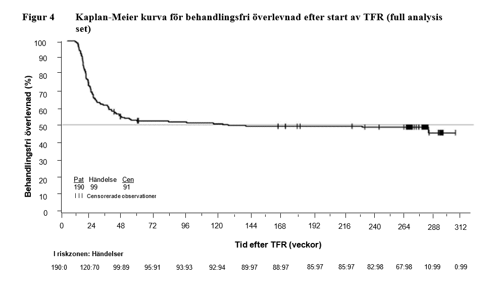 För patienter som förlorar MR4 (MR4=BCR‑ABL/ABL ≤ 0,01 % IS) men inte MMR (MMR=BCR‑ABL/ABL ≤ 0,1 % IS) under den behandlingsfria perioden ska nivåerna av BCR‑ABL transkript kontrolleras varannan vecka till dess att de återgår till ett intervall mellan MR4 och MR4,5.