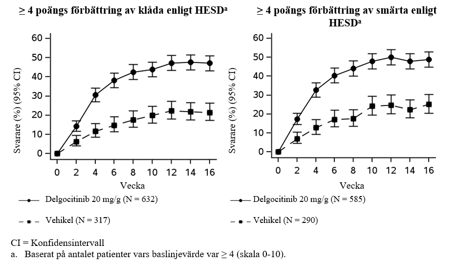 I DELTA 1 och DELTA 2 uppnådde en statistiskt signifikant större andel av patienterna som randomiserats till delgocitinib kräm det primära effektmåttet IGA-CHE TS jämfört med vehikel vid vecka 16. Resultaten för de primära och mest relevanta multiplicitetskontrollerade sekundära effektmåtten presenteras i tabell 3. Figur 1 visar andelen patienter som uppnådde en ≥ 4 poängs förbättring av klåda enligt HESD och en ≥ 4 poängs förbättring av smärta enligt HESD över tid i DELTA 1 och DELTA 2.