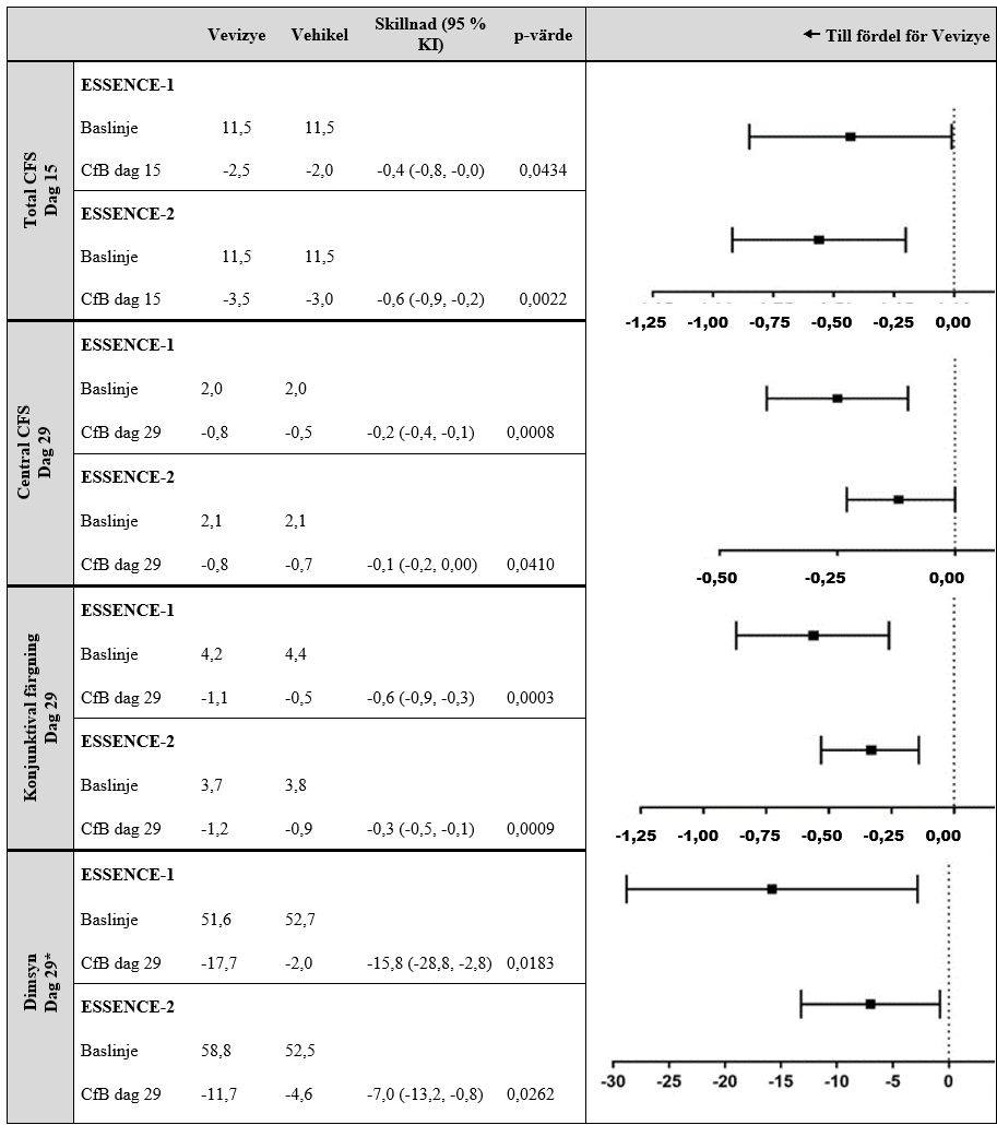 Alla övriga sekundära resultatmått, tecken på okulär yta (tCFS vid dag 15, konjunktival färgning vid dag 29 och central färgning av kornea vid dag 29), visade statistiskt signifikanta effekter till fördel för Vevizye i båda studierna vid (se figur 2).