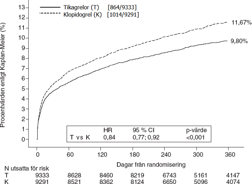 Resultatet visade sig tidigt (absolut riskreduktion [ARR] 0,6 % och relativ riskreduktion [RRR] 12 % efter 30 dagar), med en konstant behandlingseffekt under hela tolvmånadersperioden som gav en ARR på 1,9 % per år med en RRR på 16 %. Detta tyder på att det är lämpligt att behandla patienterna med tikagrelor 90 mg två gånger dagligen i 12 månader (se avsnitt 4.2). Behandling av 54 patienter med akut kranskärlssjukdom med tikagrelor i stället för klopidogrel förhindrar 1 aterotrombotisk händelse; behandling av 91 förhindrar 1 kardiovaskulär död (se figur 1 och tabell 4).