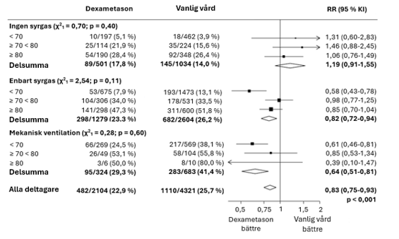 I dexametasongruppen var incidensen av dödsfall lägre än i gruppen som fick vanlig vård bland patienter som fick invasiv mekanisk ventilation (29,3 % vs. 41,4 %; frekvensförhållande, 0,64; 95 % KI, 0,51‑0,81) och hos dem som fick extra syre utan invasiv mekanisk ventilation (23,3 % vs. 26,2 %; frekvensförhållande, 0,82; 95 % KI, 0,72‑0,94).