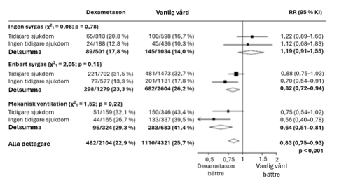 Dödligheten vid 28 dagar var signifikant lägre i dexametasongruppen än i gruppen som fick vanlig vård med en dödlighet på 482 av 2 104 patienter (22,9 %) respektive 1 110 av 4 321 patienter (25,7 %), (frekvensförhållande, 0,83; 95 % konfidensintervall [KI], 0,75‑0,93; P < 0,001).