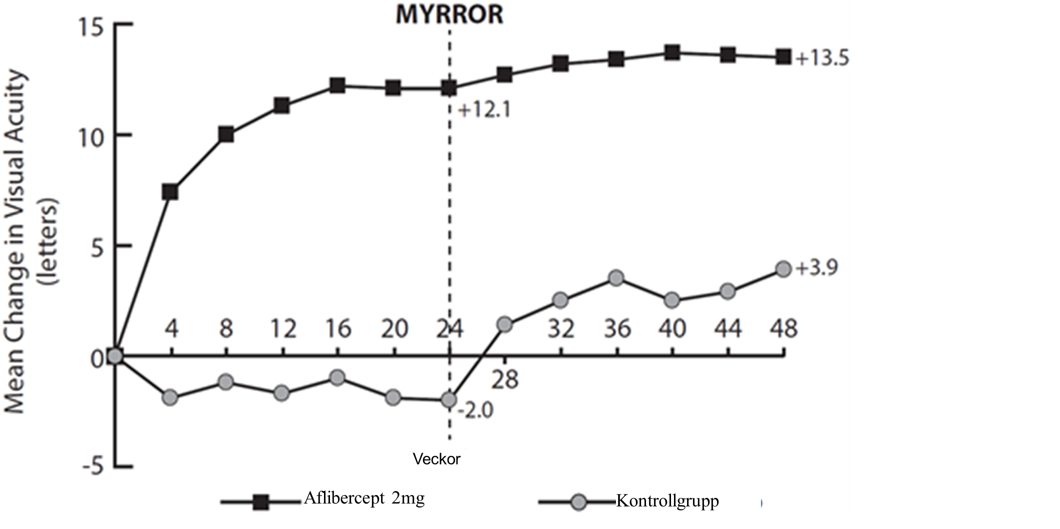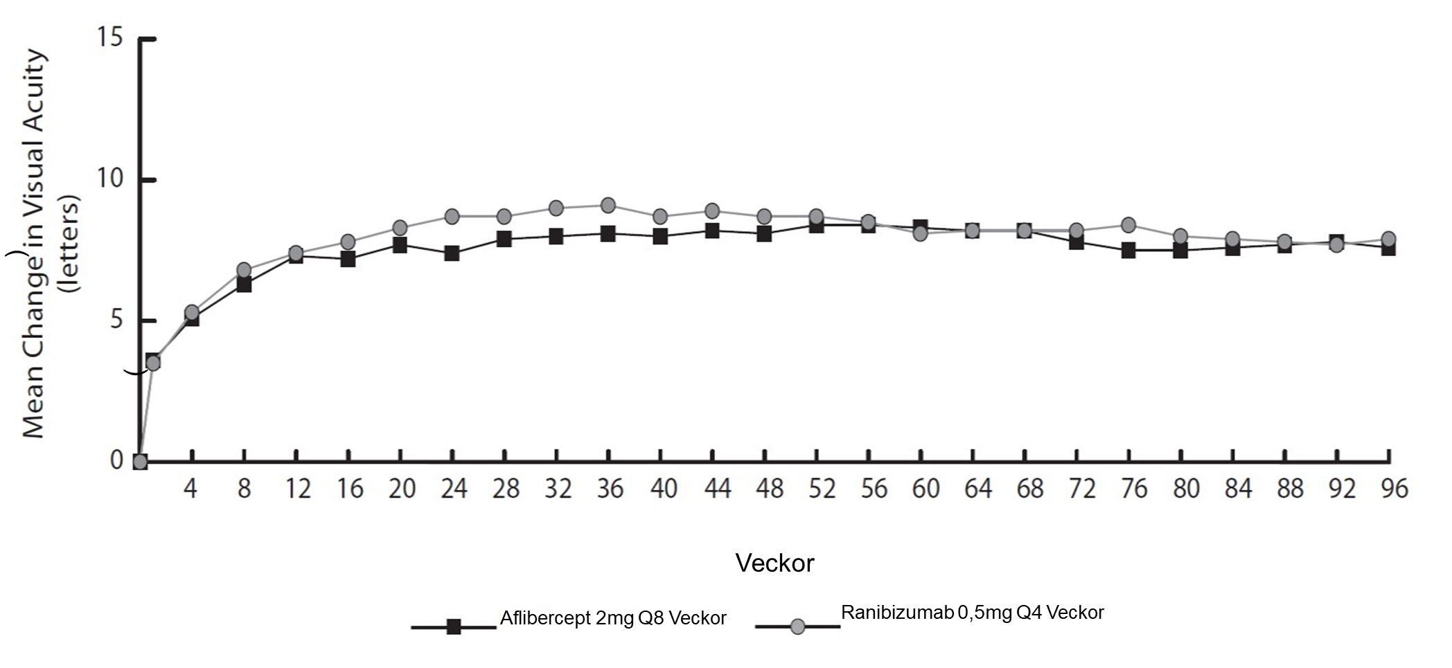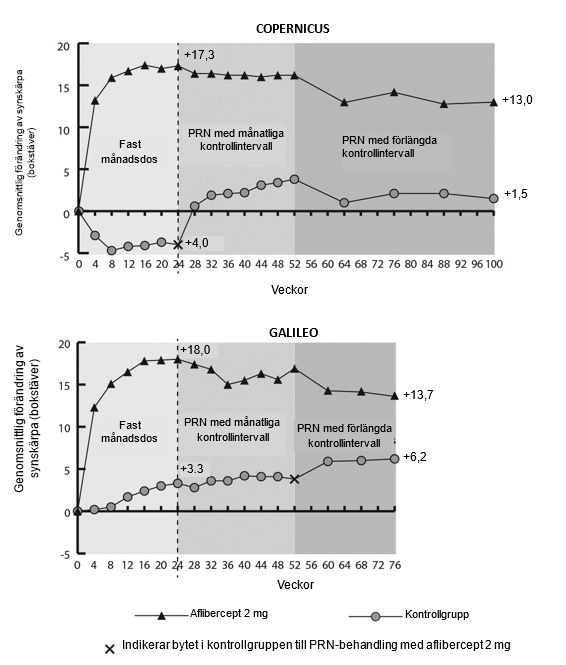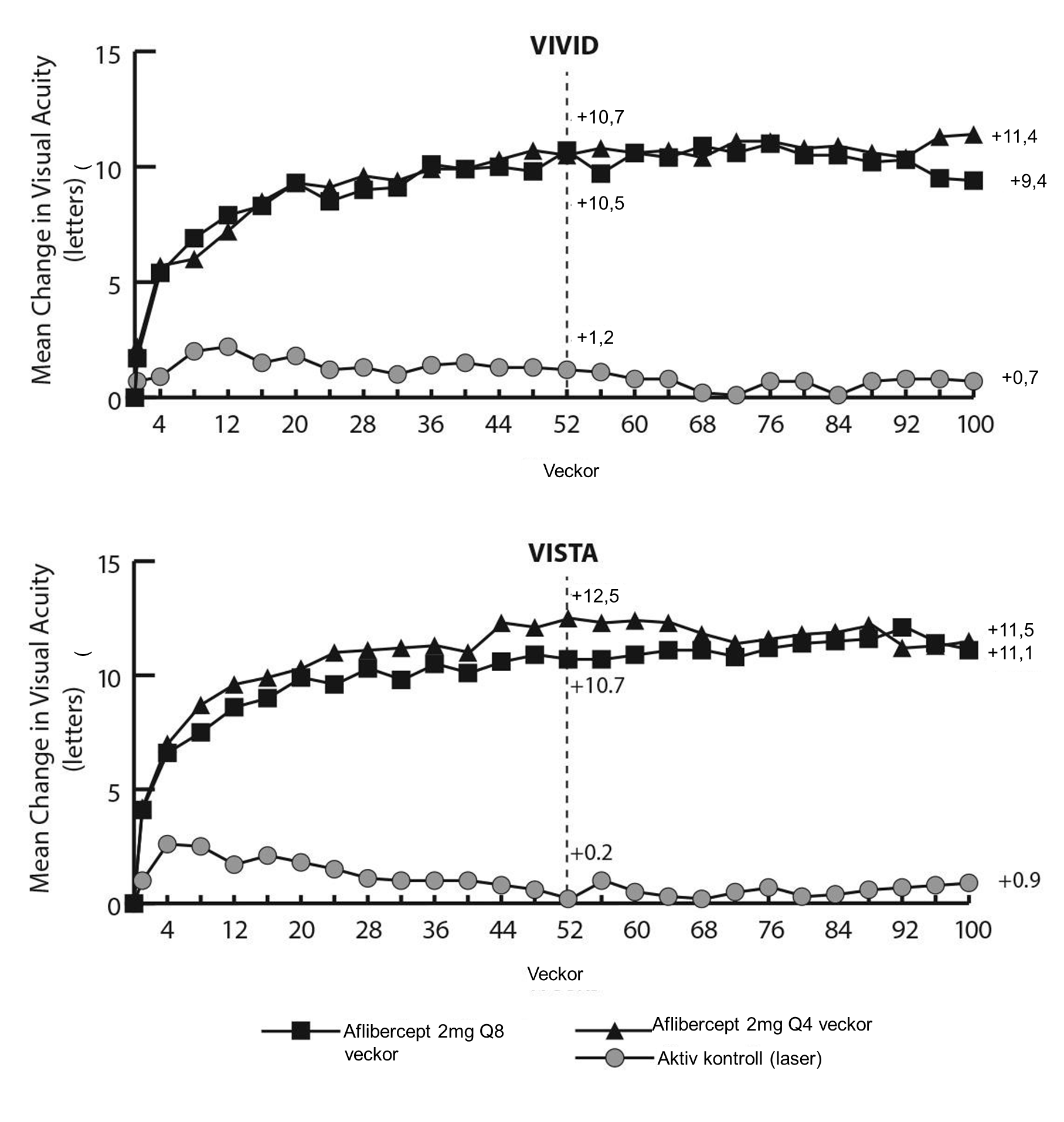 I båda studierna var det primära effektmåttet den genomsnittliga förändringen av BCVA från studiestart till vecka 52 och både aflibercept 2Q8‑ och aflibercept 2Q4‑grupperna visade på statistisk signifikans och var överlägsna kontrollgruppen. Denna nytta kvarstod till vecka 100.