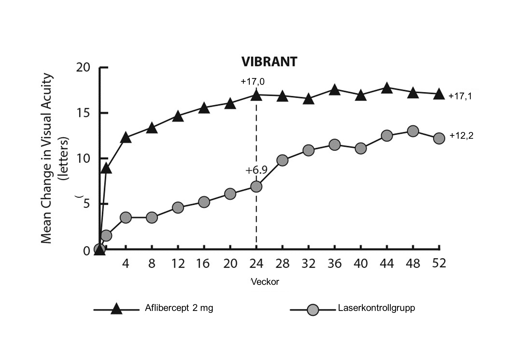 Ett sekundärt effektmått var förändring i synskärpan vecka 24 jämfört med studiestart, vilket var statistiskt signifikant till fördel för aflibercept i VIBRANT‑studien. Synförbättringen var snabb och maximal förbättring hade uppnåtts månad 3 med kvarstående behandlingseffekt till månad 12.I lasergruppen fick 67 patienter rescue‑behandling med aflibercept med början vecka 24 (aktiv kontroll/ aflibercept 2 mg grupp), vilket resulterade i förbättring av synskärpan med cirka 5 bokstäver från vecka 24 till vecka 52.