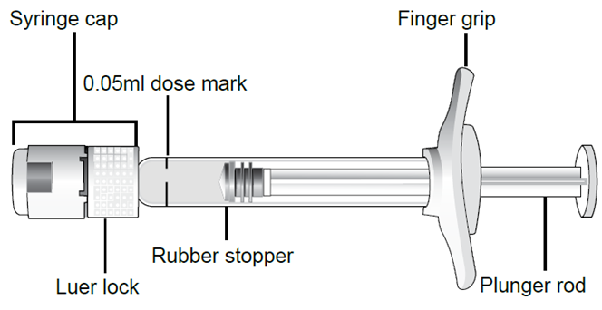 Lösning i en förfylld spruta (typ I‑glas) märkt med en doseringslinje, med en kolvpropp (elastomergummi) och en Luer‑lock‑adapter med ett lock (elastomergummi). Varje förfylld spruta innehåller en volym på minst 0,165 ml. Förpackningsstorlek: 1 förfylld spruta.