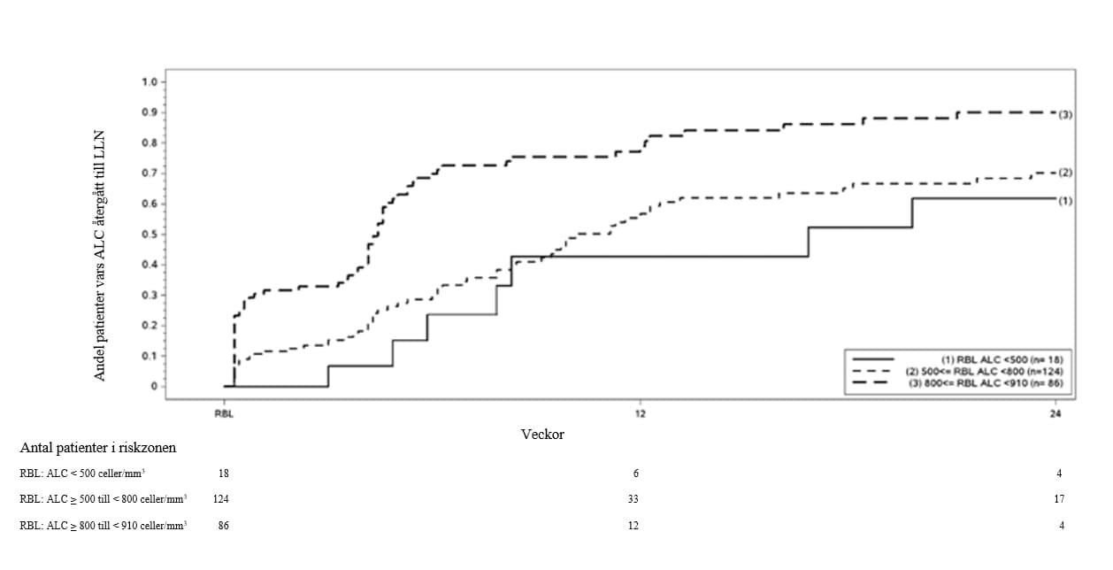 Behandlingen ska sättas ut hos patienter med långvarig svår lymfopeni (lymfocyttal < 0,5 × 109/l) som pågår i mer än 6 månader.