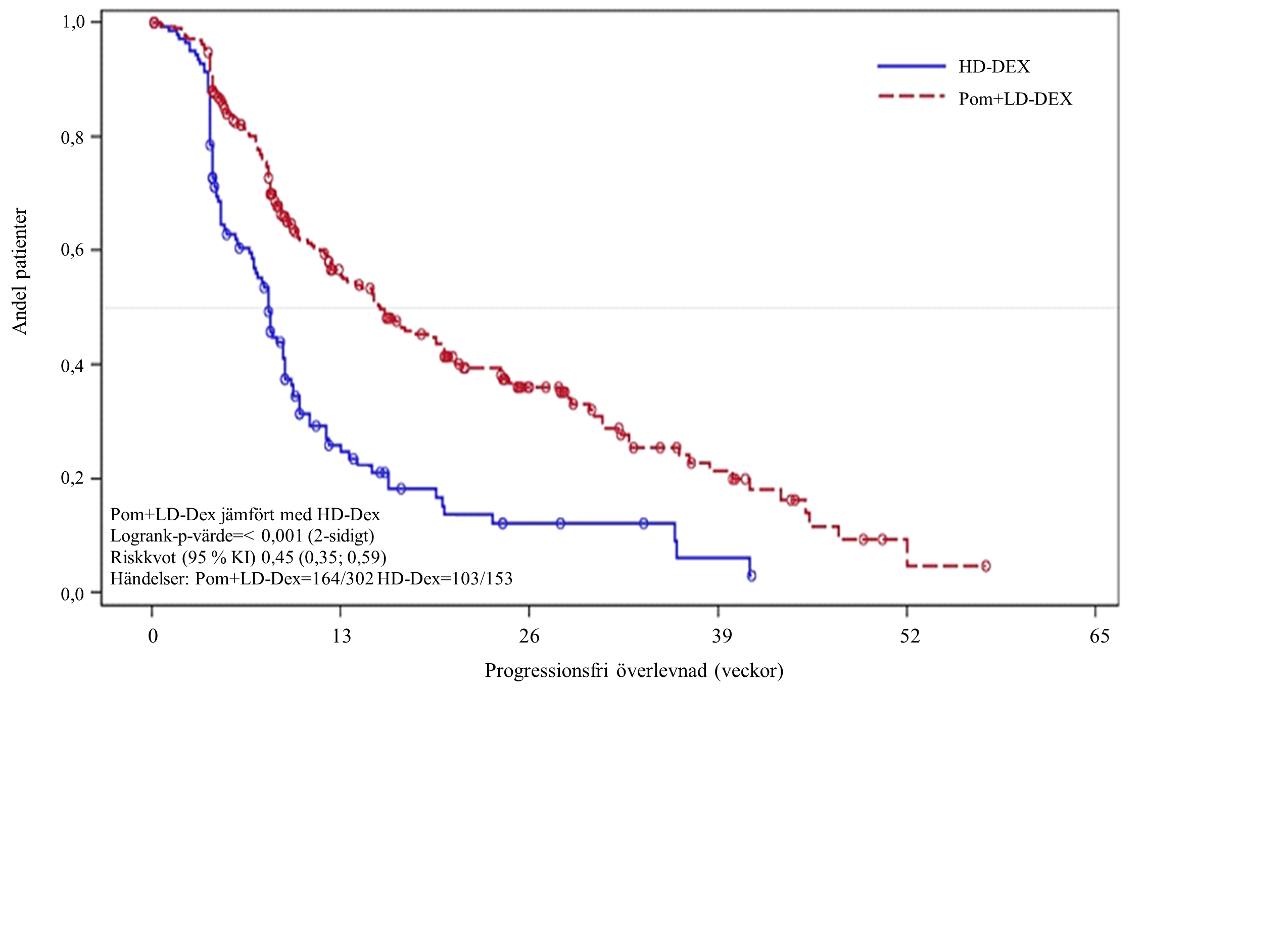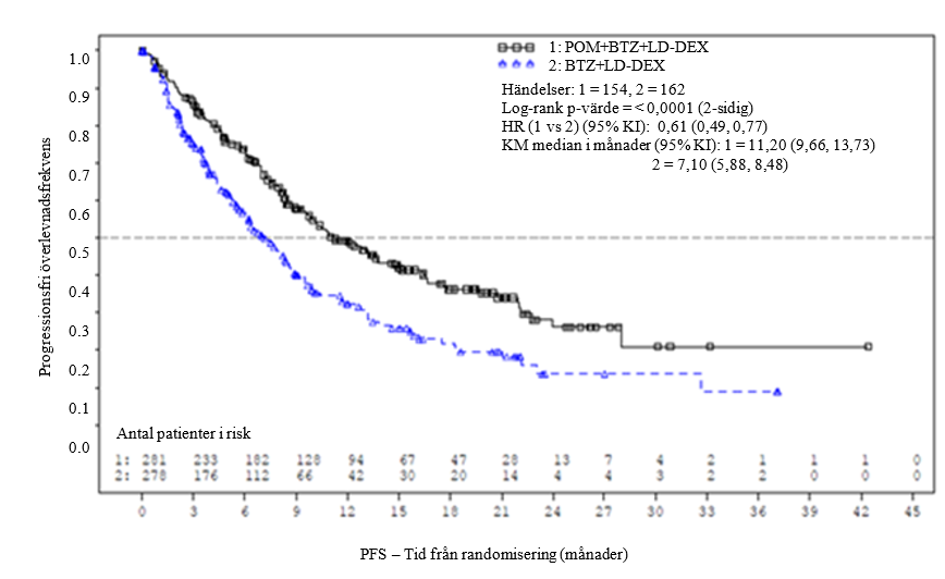 Total överlevnad var det viktigaste sekundära effektmåttet i studien. Totalt 226 (74,8 %) av Pom + LD‑Dex-patienterna och 95 (62,1 %) av HD‑Dex-patienterna var i livet vid brytdatumet (7 sept 2012). Mediantiden för total överlevnad från Kaplan-Meier-beräkningar har inte uppnåtts för Pom + LD‑Dex, men skulle väntas vara minst 48 veckor, vilket är den nedre gränsen för 95 % KI. Mediantiden för total överlevnad för armen HD‑Dex var 34 veckor (95 % KI: 23,4; 39,9). Den 1‑åriga händelsefria frekvensen var 52,6 % (± 5,72 %) för armen Pom + LD‑Dex och 28,4 % (± 7,51 %) för armen HD-Dex. Skillnaden i total överlevnad mellan de två behandlingarna var statistiskt signifikant (p < 0,001).