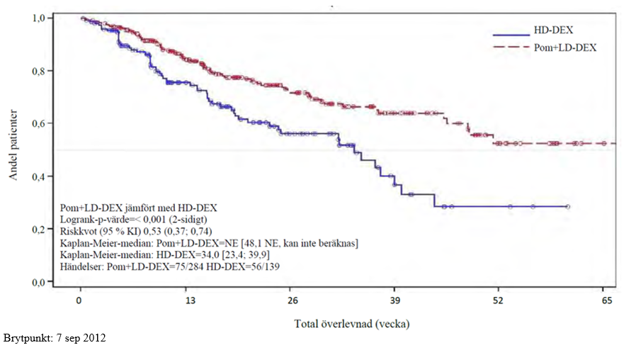 Total överlevnad var det viktigaste sekundära effektmåttet i studien. Totalt 226 (74,8 %) av Pom + LD-Dex-patienterna och 95 (62,1 %) av HD-Dex-patienterna var i livet vid brytdatumet (7 sept 2012). Mediantiden för total överlevnad från Kaplan-Meier-beräkningar har inte uppnåtts för Pom + LD Dex, men skulle väntas vara minst 48 veckor, vilket är den nedre gränsen för 95 % KI. Mediantiden för total överlevnad för armen HD-Dex var 34 veckor (95 % KI: 23,4; 39,9). Den 1-åriga händelsefria frekvensen var 52,6 % (± 5,72 %) för armen Pom + LD-Dex och 28,4 % (± 7,51 %) för armen HD-Dex. Skillnaden i total överlevnad mellan de två behandlingarna var statistiskt signifikant (p < 0,001).