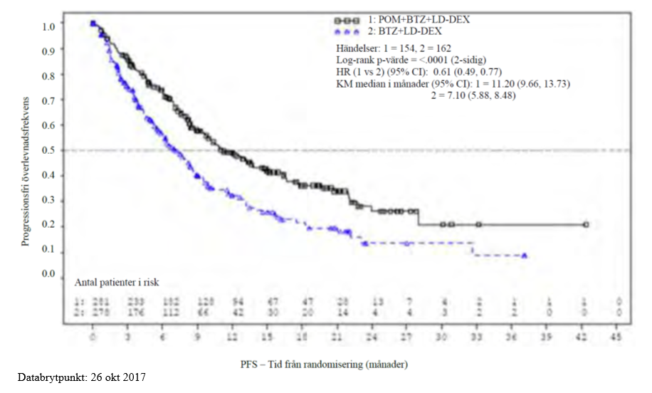 Det primära effektmåttet var progressionsfri överlevnad (progression free survival, PFS) enligt kriterier från IMWG (International Myeloma Working Group), vilket bedömdes av IRAC (Independent Review Adjudication Committee) med användning av ITT-populationen (intention to treat). Efter en medianuppföljningstid på 15,9 månader var mediantiden för PFS 11,20 månader (95 % KI: 9,66; 13,73) i Pom+Btz+LD-Dex-armen. I Btz+LD-Dex-armen var mediantiden för PFS 7,1 månader (95 % KI: 5,88; 8,48).